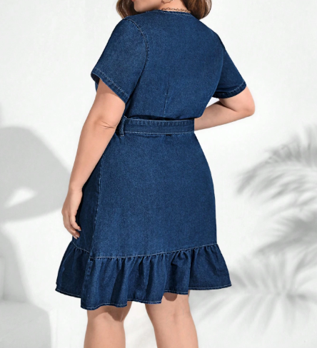 Feminine meets functional in this Surplice Neck Ruffle Hem Belted Denim Dress — a flattering wrap-style silhouette that brings effortless elegance to everyday denim. Featuring a surplice neckline, a waist-defining belt, and a flirty ruffle hem, this dress adds soft movement and shape in all the right places. The mid-weight denim gives it structure while keeping it breathable and versatile. Style it with espadrilles or sandals for a brunch-ready look, or dress it up with heels and a clutch for easy day-to-night transitions.