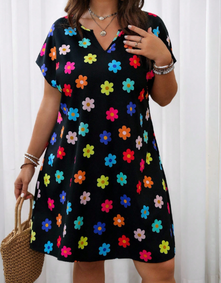 Bursting with color and carefree charm, this dress brings effortless energy to your everyday wardrobe. Featuring a vibrant floral print and relaxed batwing short sleeves, it flows with ease while making a bold statement. The notched neckline adds a touch of structure and modern femininity.