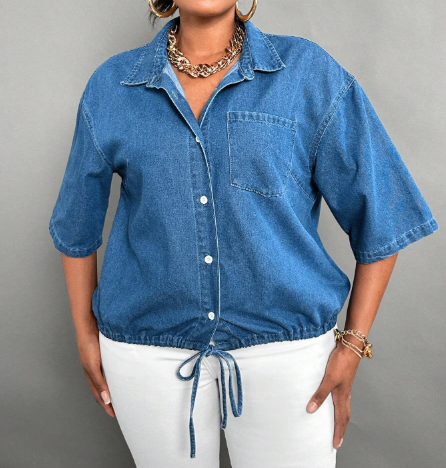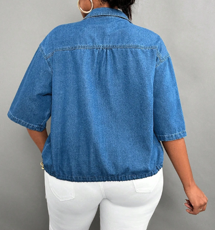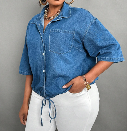 STYLE NOTE: Denim Shirt with Three-Quarter Sleeves – Sexy & Casual. Designed for a versatile fit, this shirt combines a loose yet slimming silhouette with a relaxed off-shoulder neckline. Perfect for pairing with jeans, skirts, or shorts for a chic, effortless look. Ideal for casual outings, weekend brunches, or summer evenings.