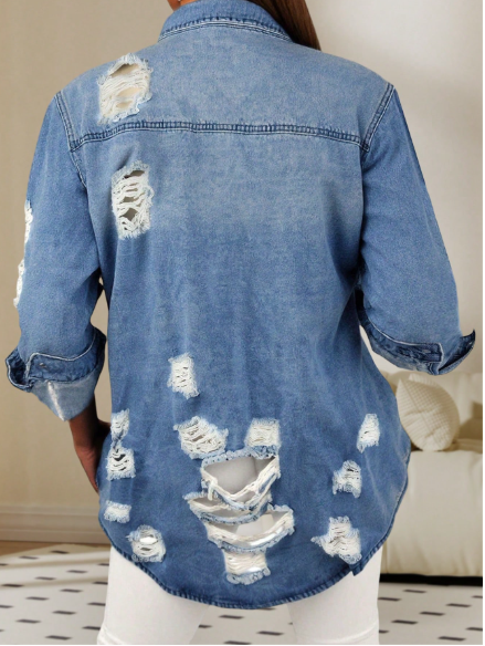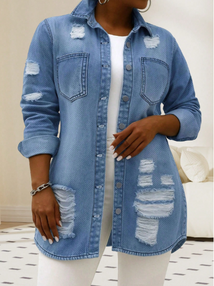 Effortlessly cool with a touch of edge, this mid-length distressed denim jacket is the perfect layering essential for every season. Designed with a relaxed silhouette and a flattering longer cut, it provides comfortable coverage while maintaining that laid-back street-style vibe.