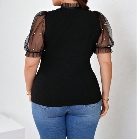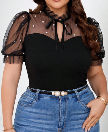 Elegant, feminine, and a little bit dramatic — this mesh contrast tie-neck puff sleeve top is made to stand out with sophistication. The sheer mesh neckline brings soft allure, while the tie-neck bow detail adds a polished, romantic touch you can style loose or neatly tied. Puff sleeves create graceful volume, balancing the sleek, flattering body for a refined silhouette that transitions beautifully from day to evening.