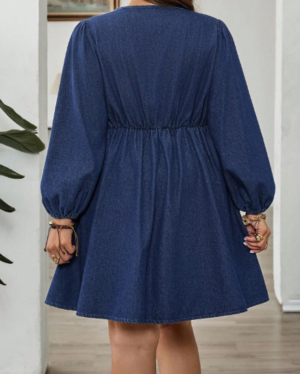 Feminine with a statement twist, this denim dress features voluminous lantern sleeves that add soft drama and elegance. The delicate tie-bow detail enhances the silhouette with a touch of charm, while the structured denim keeps the look modern and refined. Perfect for brunch dates, special outings, or elevated everyday wear, this piece blends playful romance with effortless style.