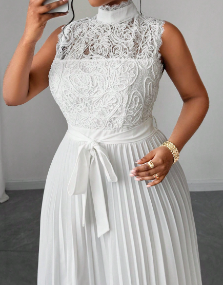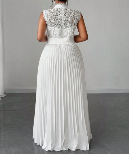 Sophisticated and timeless, this floor-length elegant maxi dress is designed to make a statement. Featuring a stand-up collar, delicate lace trim, and lace patchwork detailing, this dress blends classic elegance with modern style. The pleated skirt adds graceful movement, while the waist belt enhances your silhouette for a flattering fit. Finished with a back zipper closure, this piece is perfect for formal events, weddings, and special occasions.