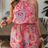 Channel carefree holiday vibes with this floral all-over print halter romper — a must-have for sun-soaked days and spontaneous getaways. The halter neckline offers a flattering, summery silhouette, while the vibrant floral print brings a playful, feminine charm to your look. Lightweight and easy to wear, it’s perfect for strolling seaside towns, lounging by the resort pool, or heading out for a casual brunch. Pair it with strappy sandals, a floppy hat, and woven accessories for that effortless vacation-ready finish.
