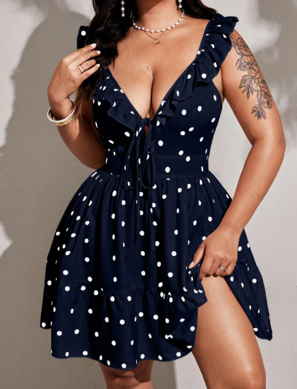 Embrace timeless romance in our Chiffon Polka Dot Deep V-Neck Maxi Dress. Crafted from airy chiffon, this flowing silhouette features a sultry deep V neckline balanced by soft ruffle hems for graceful movement. The classic polka dot print adds vintage charm, while the delicate bowknot detail enhances its feminine, romantic appeal.