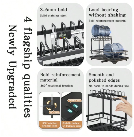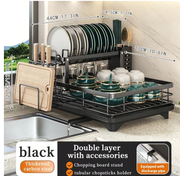 Keep your kitchen tidy and stylish with this Top-Grade Stainless Steel 2-Tier Dish Drying Rack, thoughtfully designed for modern kitchens. Crafted from high-quality stainless steel, this durable rack provides sturdy support for plates, bowls, and other kitchen essentials while allowing them to air dry efficiently. The two-tier structure maximizes vertical space, and the included utensil caddy and cutting board holder make organizing easy and convenient. Sleek, practical, and space-saving, this dish rack is a must-have for any kitchen that values both function and style. 🍽️✨