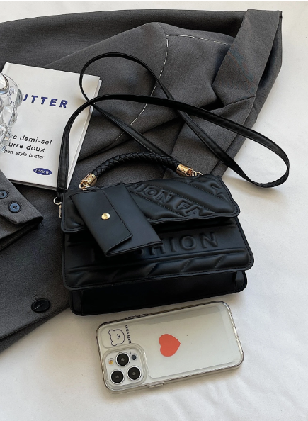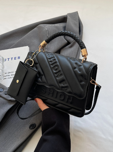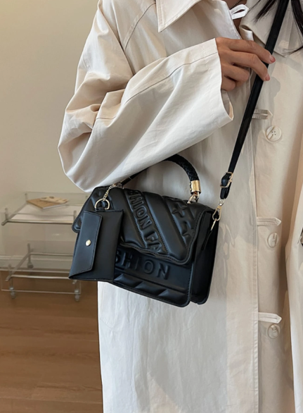 Practicality meets polished style in this Flap Closure Handbag. Designed with embossed letter print for a modern touch, it comes with a matching card holder for everyday convenience. The structured crossbody silhouette keeps essentials secure while offering hands-free ease, making it perfect for both on-the-go errands and casual outings. Pair it with jeans and a chic blouse for effortless daytime style, or with a sleek dress to add a functional yet fashionable finish.