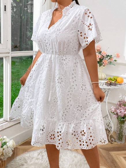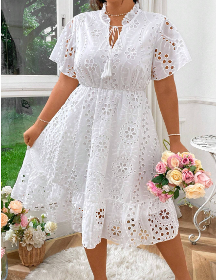 Soft, sweet, and effortlessly feminine — this dress brings classic charm with a modern twist. The tie-neck detail adds a touch of vintage elegance, while the short sleeves keep it light and comfortable. The eyelet-embroidered ruffle hem brings in that delicate boutique finish, giving every step a graceful, airy movement. Perfect for brunch dates, casual outings, and sunny-day moments.