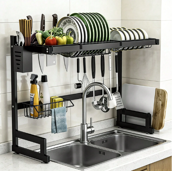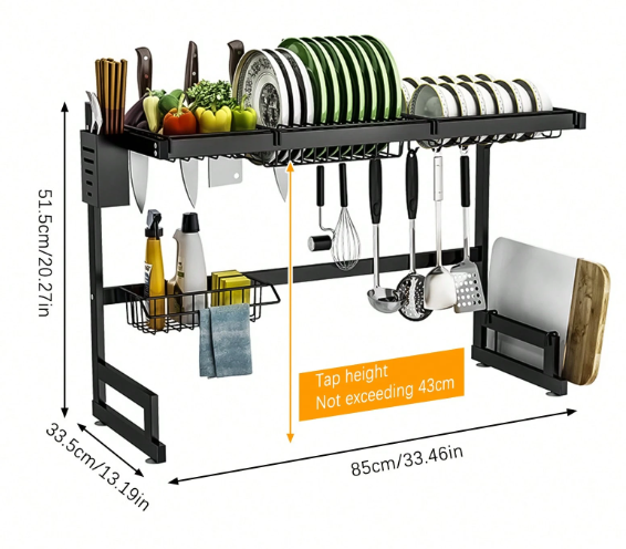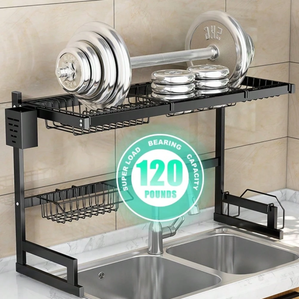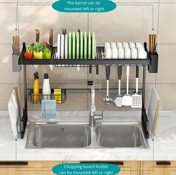 Features: Space-saving design, multi-layer storage, durable stainless steel, suitable for most kitchen sinks. ✨🍽️